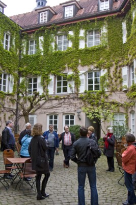 Alle lauschen den Ausführungen der Stadtführerin beim ehemaligen Badehaus. |